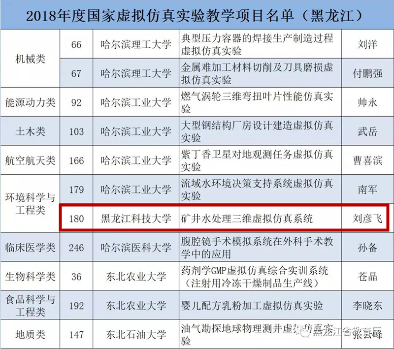 近日,教育部公布了2018年度国家虚拟仿真实验教学项目认定结果,全国186所高校的296个项目入选国家虚拟仿真实验教学项目, 黑龙江省共有公司、哈尔滨工业大学、东北农业大学、哈尔滨理工大学、哈尔滨医科大学、东北石油大学等6所高校的11个教学项目榜上有名。公司刘彦飞教授的“矿井水处理三维虚拟仿真系统”入选, 实现了公司该类项目零的突破。
