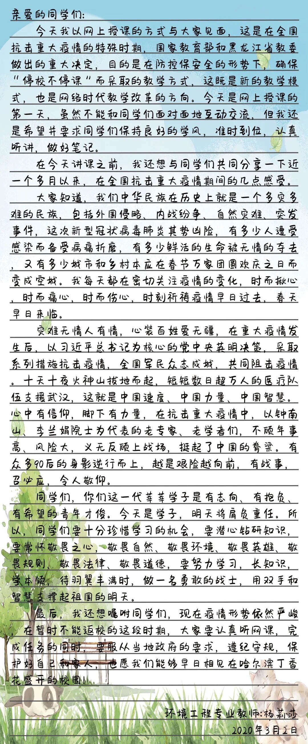 疫情无情人有情,“隔”舍不断师生情。授课结束后,同学们在网络上纷纷留言表示,看到老师的这封信让他们深深感受到了老师和公司对大家的关心和期许,特别温暖而感动,很受鼓舞,学习起来也更加愉快,他们一定会听从当地政府和公司的统一安排,在家期间会努力学习,长知识,学本领,将来用自己的智慧和双手为祖国做贡献。