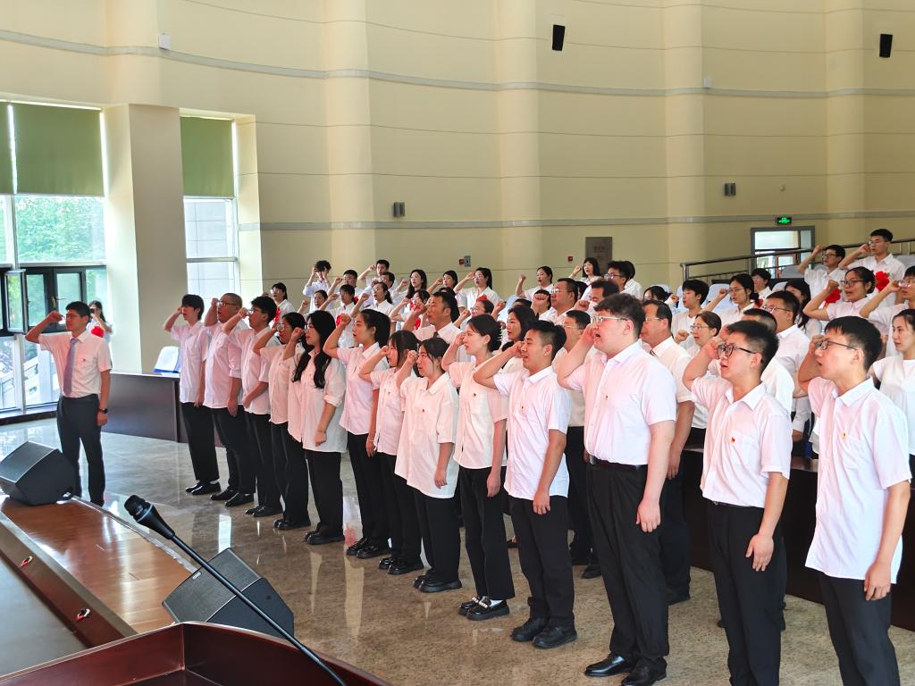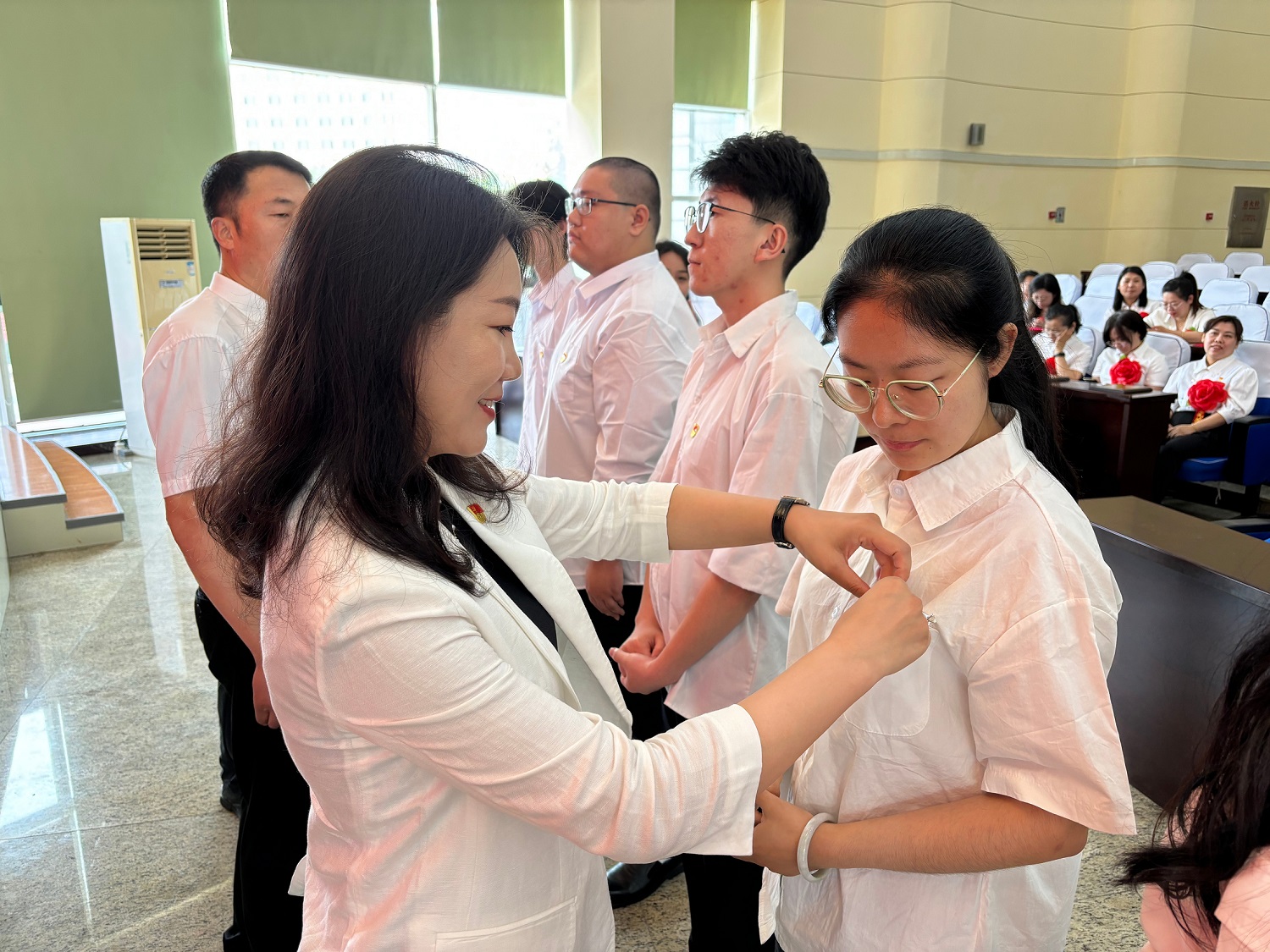 公司党委委员为15名新党员佩戴党员党徽,并进行新党员入党宣誓和老党员重温入党誓词。入党誓词由公司党委委员周惠玉领誓。
